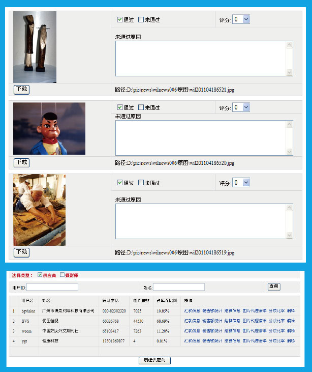 根據(jù)訂購(gòu)日期和圖片名稱可進(jìn)行查詢,顯示用戶訂購(gòu)的RM圖片具體信息,可查看訂購(gòu)會(huì)員的具體資 料,無(wú)論是否具有該尺寸的圖片,支持郵件信息反饋賣家身份審核:根據(jù)用戶名,姓名,審核狀態(tài)來(lái)查詢相應(yīng)用戶,可查看賣家提交的詳細(xì)信息來(lái)審核用戶是否具有賣家的資格。