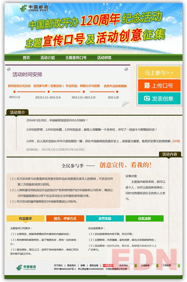 中國郵政中國郵政開辦120周年活動主題及活動方案征集活動啟動,怡康開發(fā)制作團隊,在段時間內(nèi)完成從設(shè)計,功能開發(fā),頁面承現(xiàn),并第一時間把專題上線。工作效率及負責(zé)的態(tài)度受客戶好評。