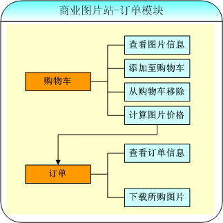 商業(yè)圖片站-訂單模塊是用來(lái)實(shí)現(xiàn)用購(gòu)物車選購(gòu)圖片、結(jié)賬并通過(guò)訂單下載所購(gòu)圖片的功能,該模塊包括購(gòu)物車部分(查看所購(gòu)圖片信息、添加至購(gòu)物車、從購(gòu)物車中移除和計(jì)算圖片價(jià)格)和訂單部分(查看所購(gòu)買訂單的信息和下載所購(gòu)買的圖片)。