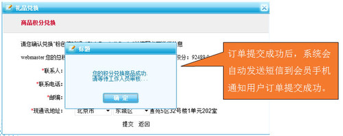 如會員想要兌換此商品,點擊“立即兌換”,進入兌換頁面,該頁面顯示出兌換的商品及所需積分,并需要會員確認送貨信息。點擊“提交”即完成兌換,并生成兌換訂單。